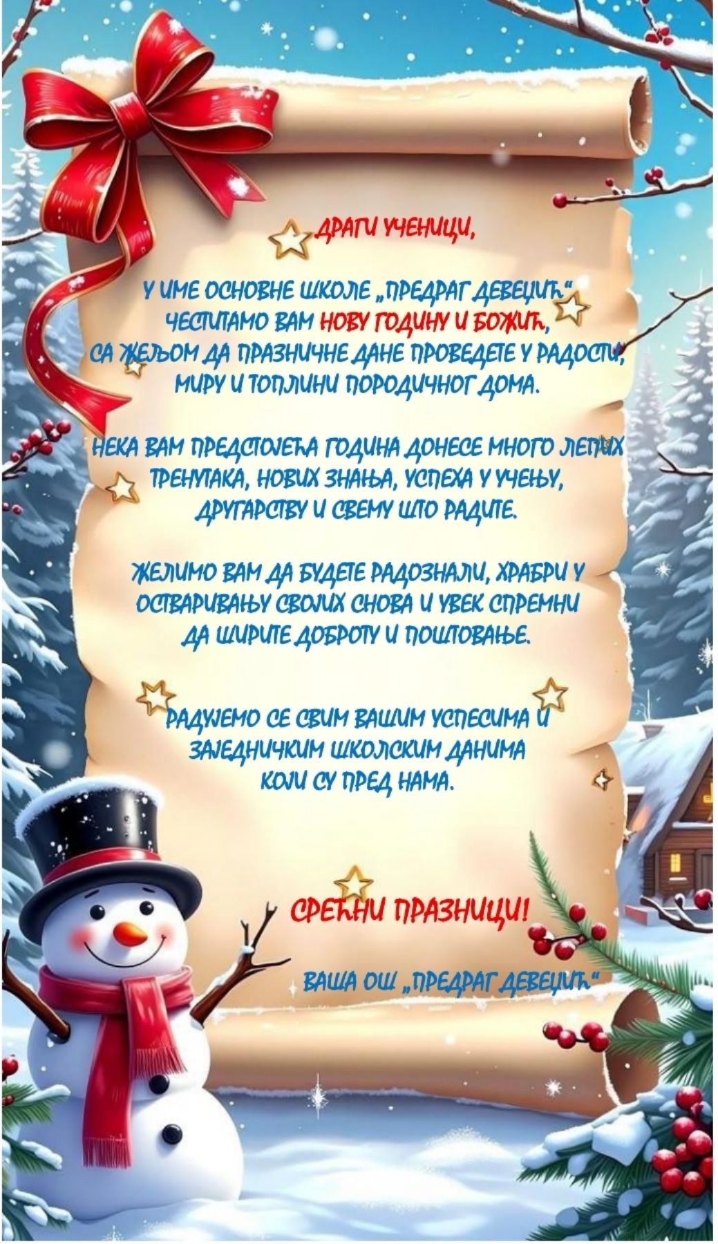 Саопштавање успеха и подела ђачких књижица биће у петак, 9. 1. 2026. године:➡️ за ученике од 5. до 8. разреда у 11 сати;➡️ за... |